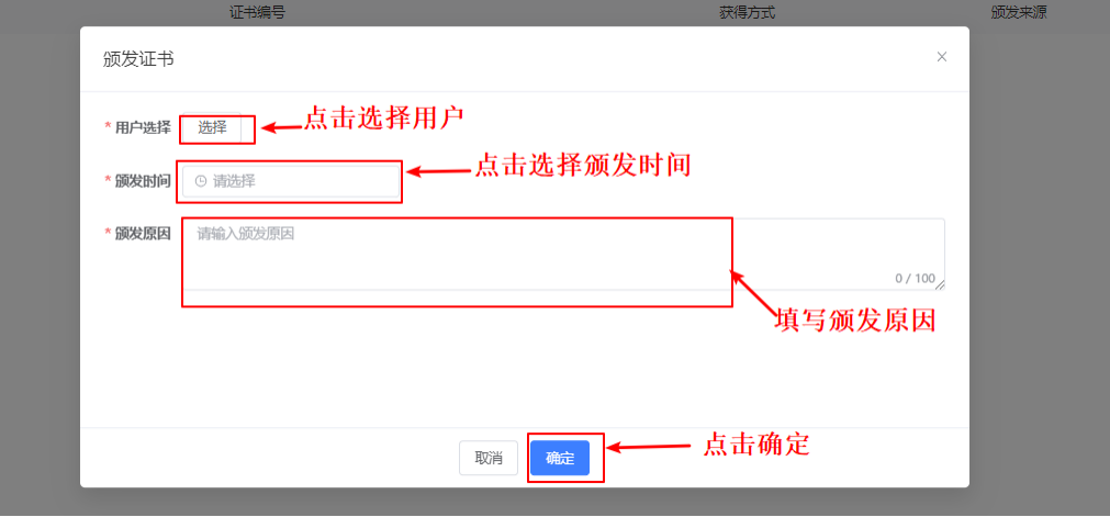 步骤2:选择颁发人员,填写信息,点击【确定】