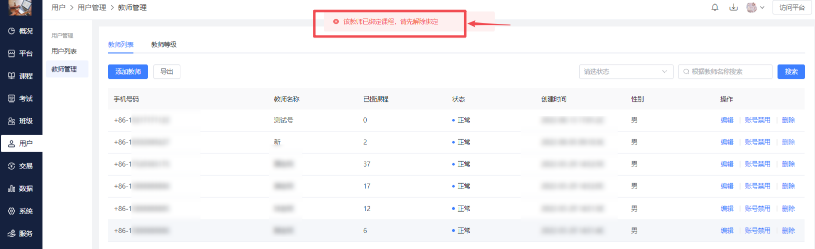 (注意:绑定课程和设置为班级班主任的教师无法删除)