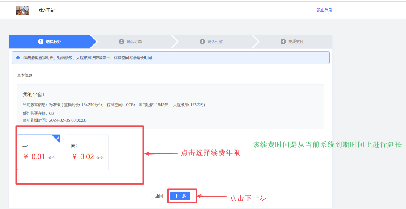 步骤1:点击进入续费升级页面,点击按钮【前往续费升级】