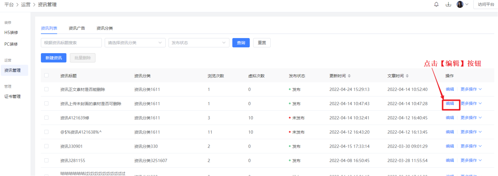 步骤1:在资讯列表中点击一个资讯的【编辑】按钮