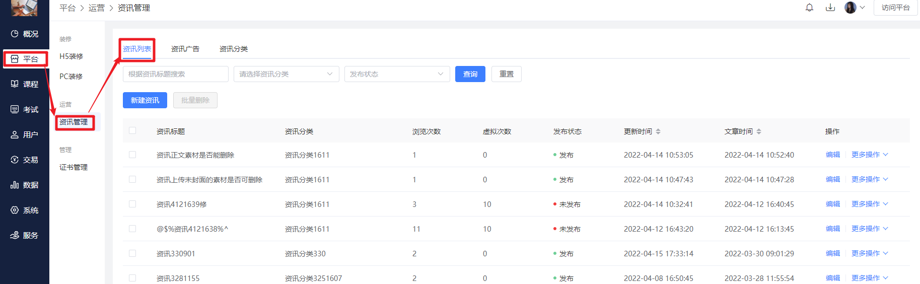 进入路径:【平台】>>【资讯管理】>>【资讯列表】