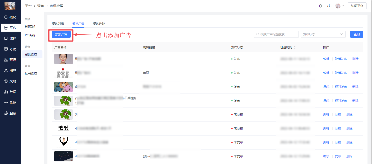 点击左侧【平台】栏目下的【资讯管理】,切换tab到【资讯广告】可进入资讯广告列表页,点击相应按钮可进行新建资讯广告、编辑、删除、取消发布资讯广告等操作。