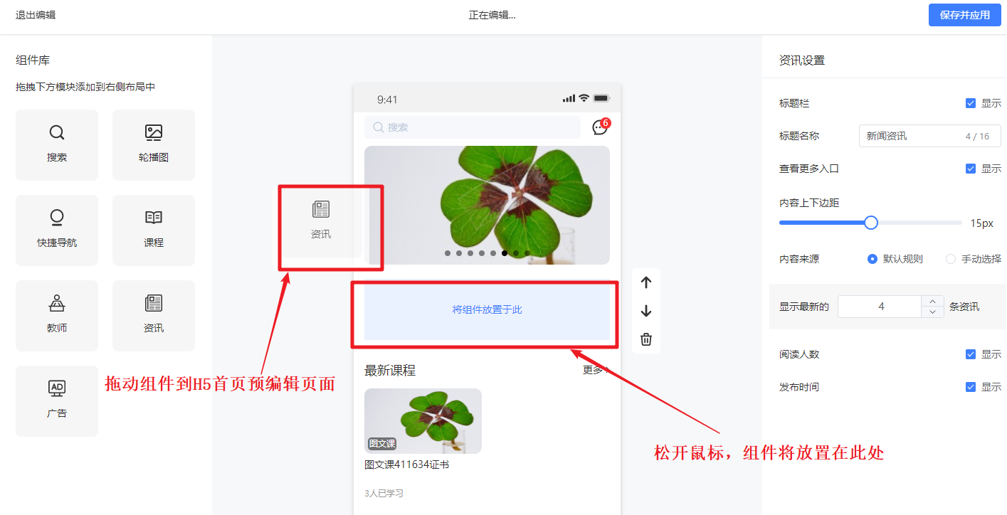 步骤2:将组件拖动到H5首页预编辑页面,选定位置松开鼠标即可添加组件