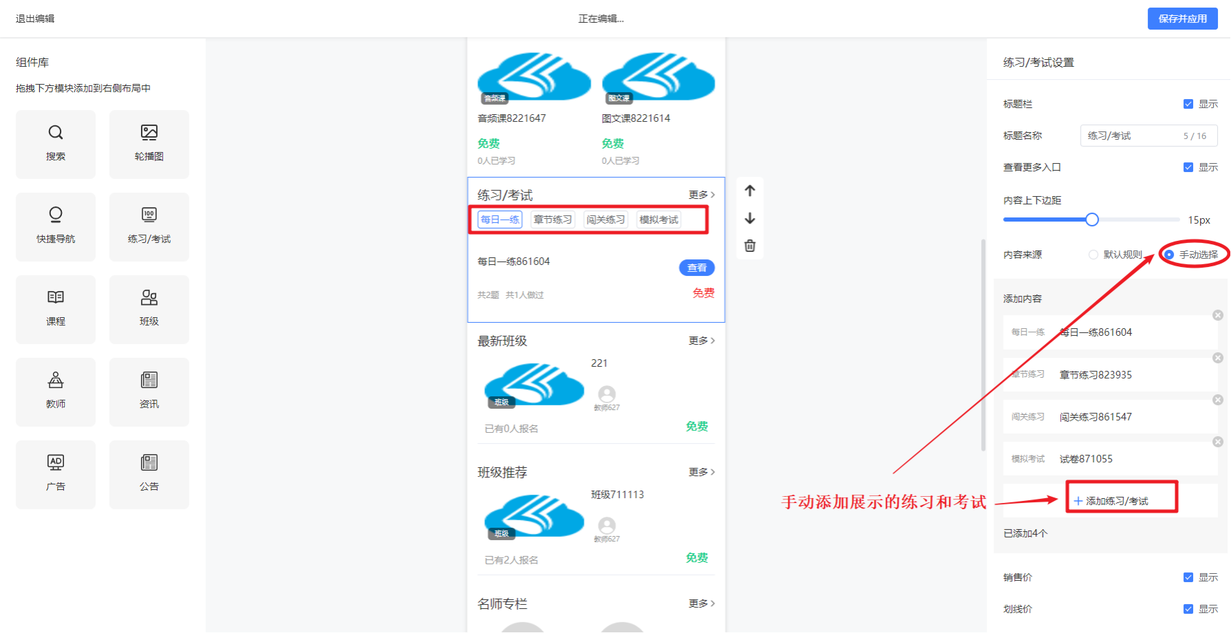 (注意:广告最多添加3个) 8. 练习/考试组件