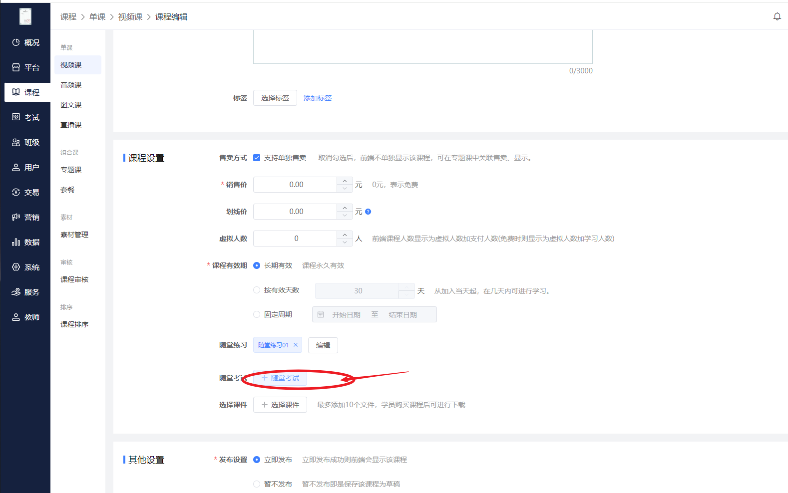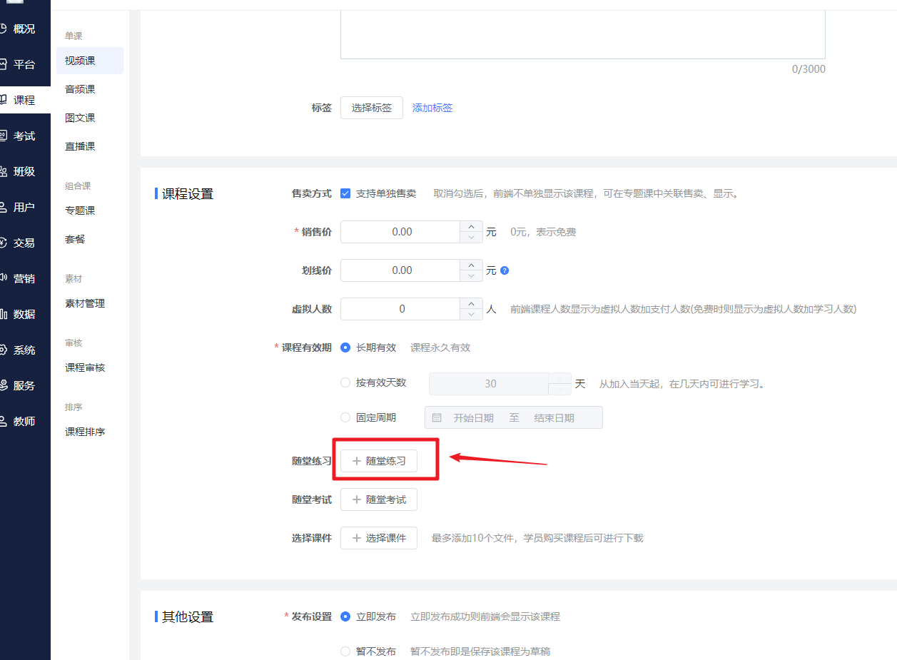 在课程中可自定义添加随堂练习、随堂考试、课件。操作说明如下: