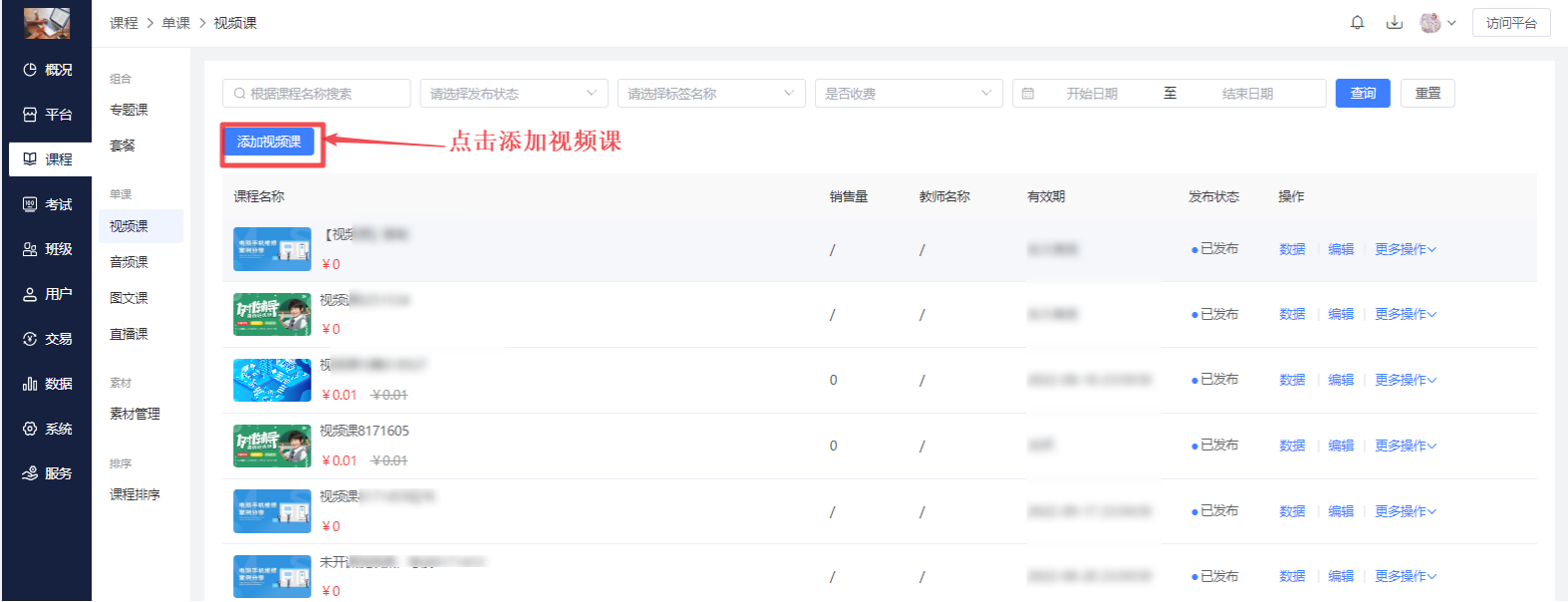 点击左侧【课程】栏目下的【视频课】/【音频课】可进入视频课列表页,点击相应按钮可进行新建、数据管理等操作。